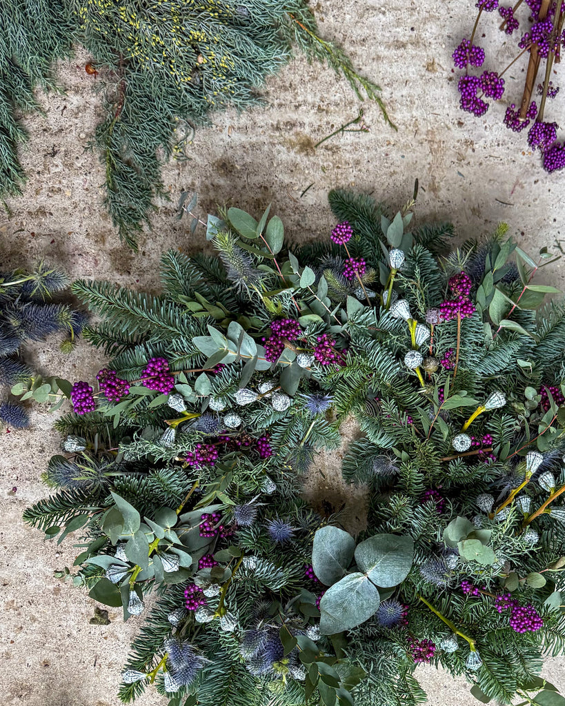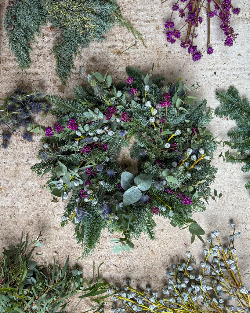Celebrate the season with this beaut Christmas wreath! Thistle, boule and purple berries nestled in an abundance of Christmas tree spruce, lush foliage, grasses, all arranged on a natural moss base.